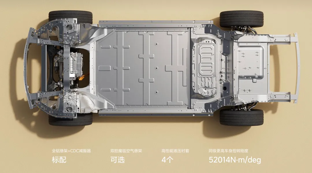悬架系统为前双叉臂加后五连杆独立悬架,同时双腔空气悬架+CDC可变阻尼减振器提升稳定性,高车身扭转刚度(52014N·m/deg),为底盘提供坚实基础。