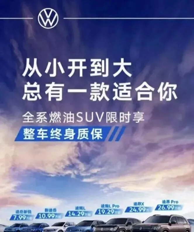终身质保从途昂Pro扩到全系燃油SUV,连一口价7.99万的途岳新锐也在范围里;用车成本往下压,残值还提到2%-3%。