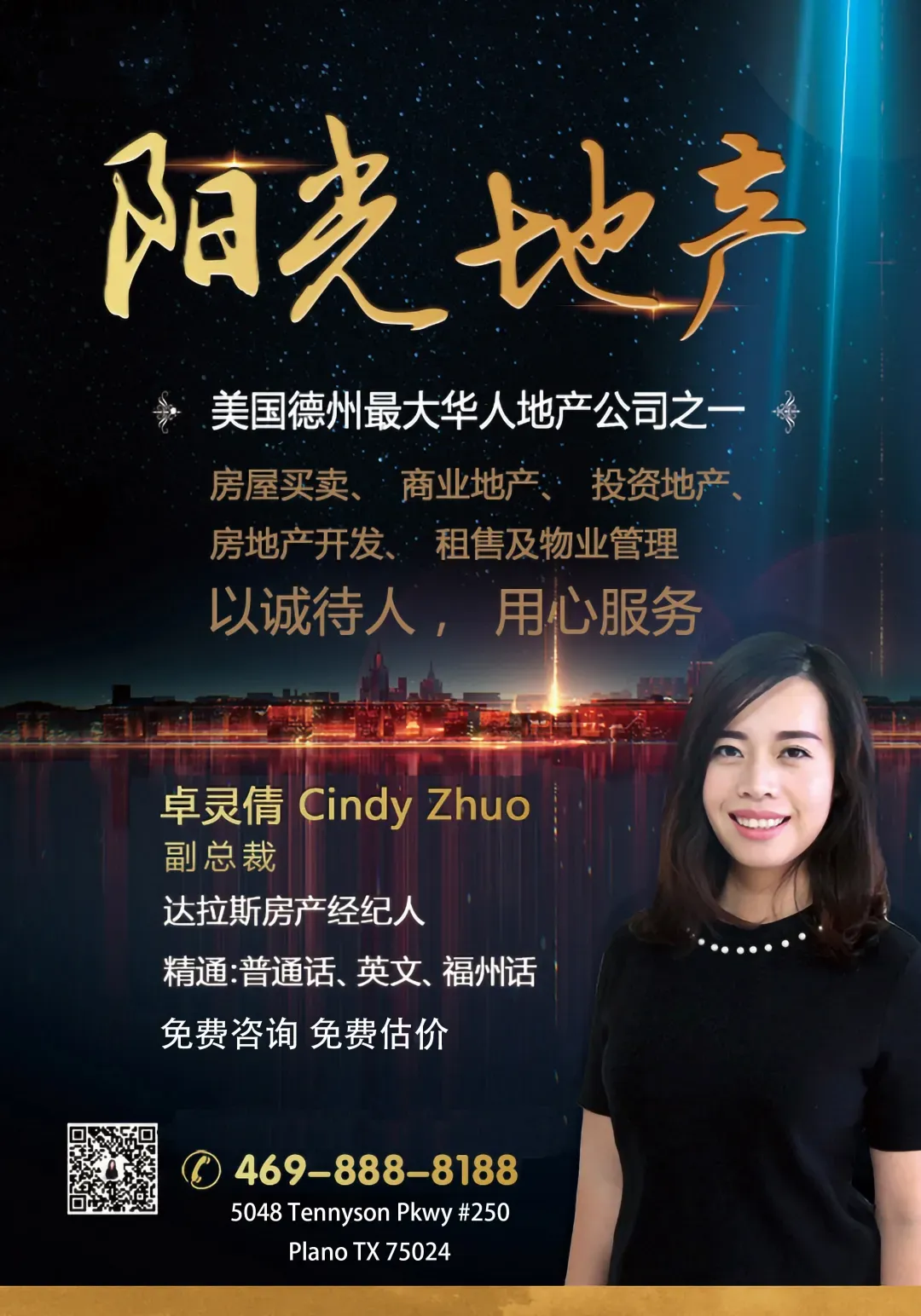 如果需要了解住宅买卖,商业房产相关信息,请联系我们的房产经纪人卓灵倩(Cindy Zhuo)她将为您提供最全面的解答,欢迎您登入网站www.cindyzhuo.com或随时来电咨询。电话:469-888-8188或254-433-9542,微信号:345022204