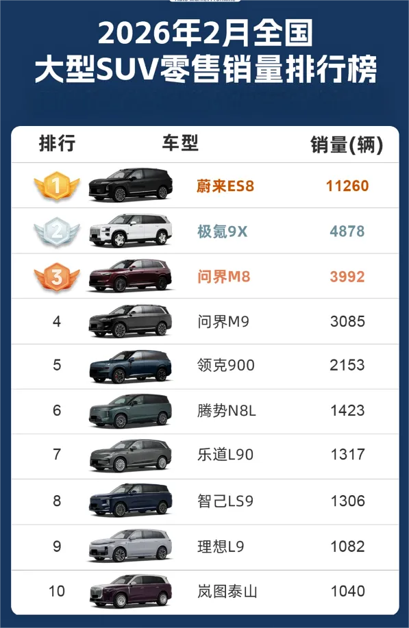 2026年2月,国内车市受春节假期、市场淡季及新能源汽车新政叠加影响,整体销量环比回落,但大型SUV细分市场仍展现出强劲韧性。根据最新零售销量数据,2月全国大型SUV销量前十均为自主新能源品牌,蔚来ES8优势显著,极氪9X表现突出,问界双雄稳步发挥,理想L9、岚图泰山等呈现差异化表现。这份榜单清晰勾勒出当前市场竞争格局,更折射出行业全新趋势,高端化、新能源化、智能化已成为核心增长引擎,行业竞争进入白热化。