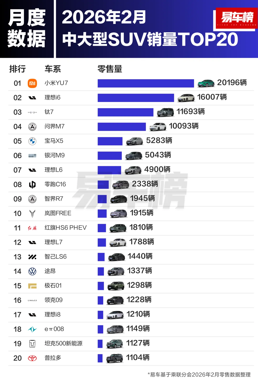 中大型SUV销量前3名分别为:小米YU7、理想i6、钛7;销量分别为:20196辆、16007辆、11693辆