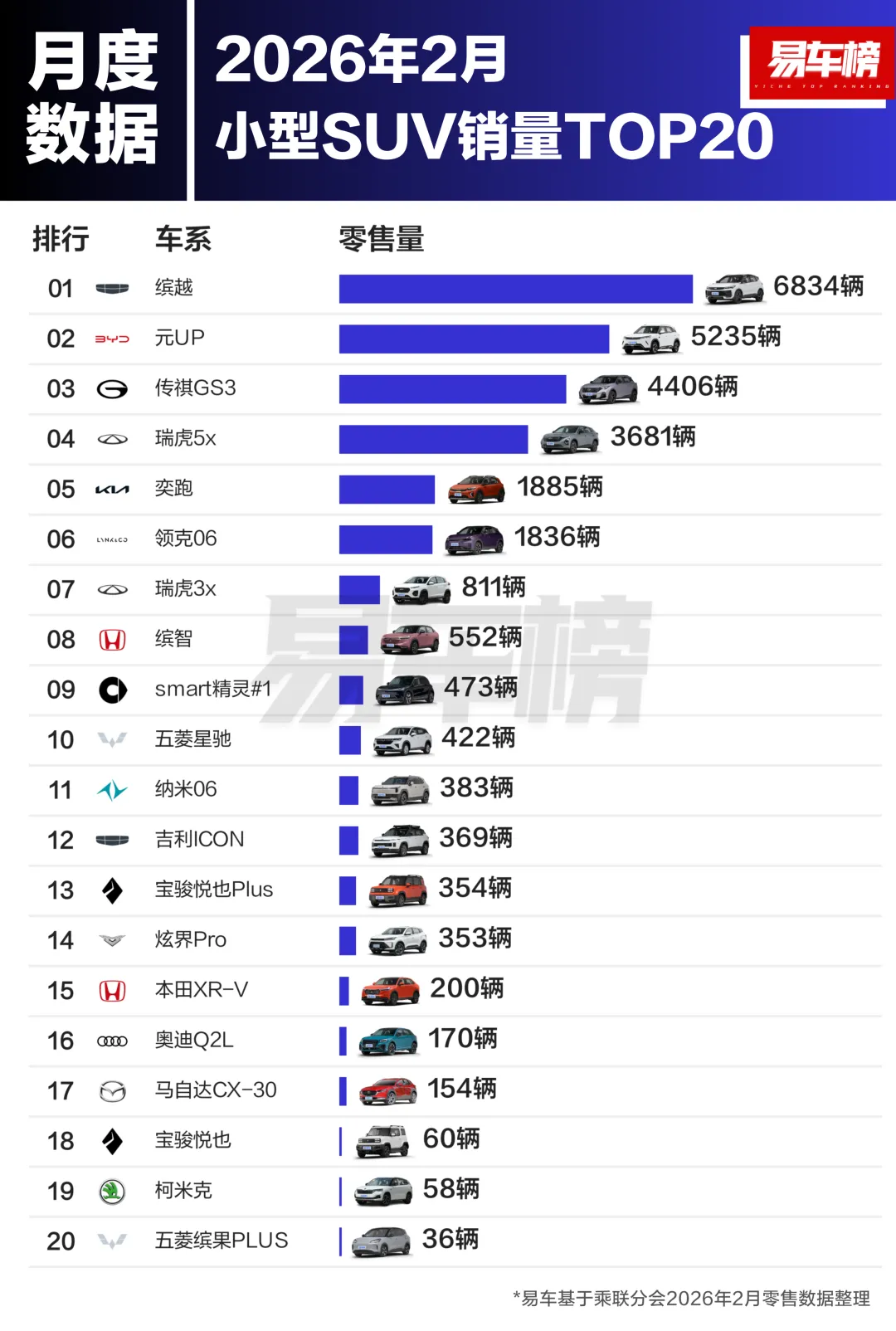 小型SUV销量前3名分别为:缤越、元UP、传祺GS3;销量分别为:6834辆、5235辆、4406辆