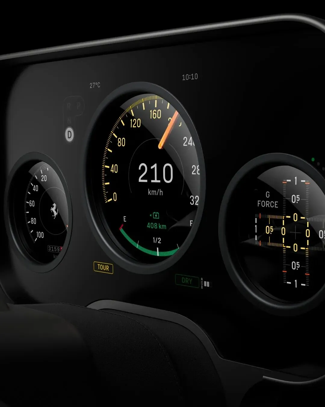 仪表盘:致敬经典机械仪表,采用双层OLED面板叠加设计。通过两层屏幕的错位叠加,营造出独特的视觉景深,指针扫过时数字显现,既有机械的仪式感,又有数字化的清晰度。