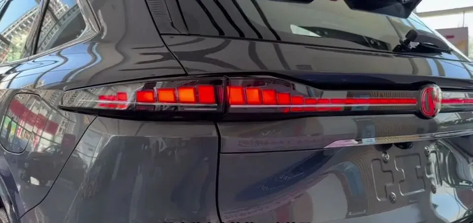 车尾部分,它也是当下非常流行的贯穿式尾灯,这个尾灯内部也是挺精致的,是这种小方块的一个效果,点亮之后辨识度挺高的。