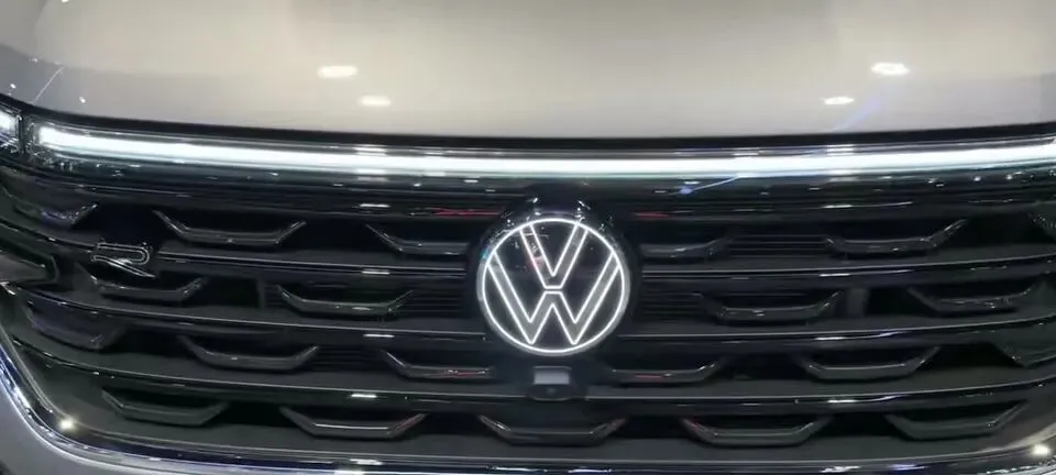 “大众途昂汽车logo特写展示,logo带有灯光效果。”