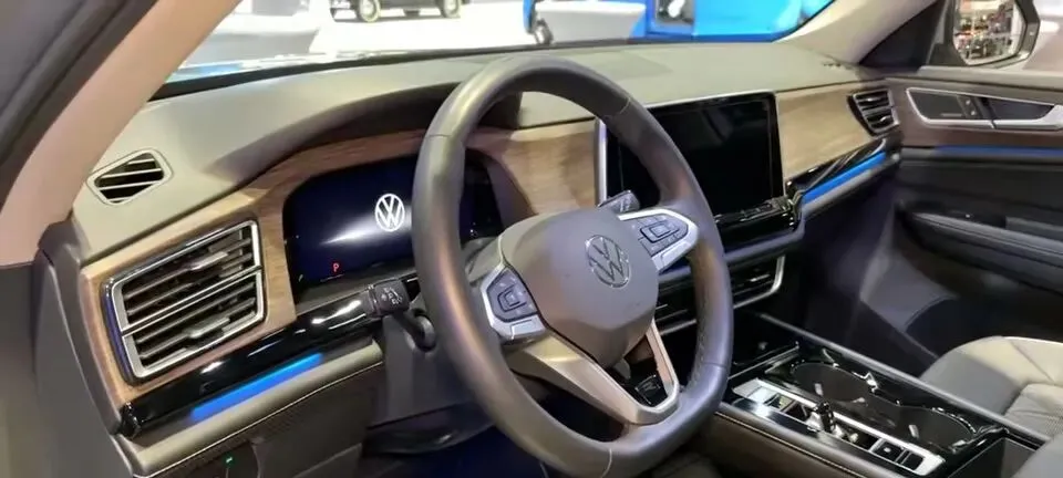 原句是:“大众途昂车身内部驾驶位展示,包括方向盘、中控显示屏、内饰等。”