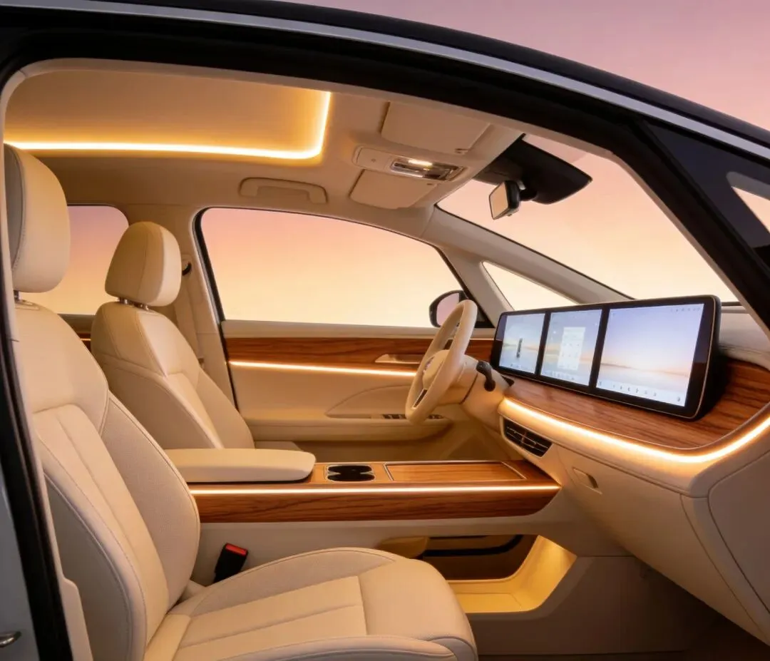 中控没拼三块大屏,只有一块15.6英寸,下面嵌在木纹饰板里,手摸上去是温的。叫“Smart Surface魔术屏”,关了就是实木,点了才亮。氛围灯是四层,但不是乱闪,是跟着空调温度变色——冷气开大时泛蓝,暖风上来渐成琥珀色。我没拍视频,但记住了那光,像我家老式台灯罩子透出来的颜色。
