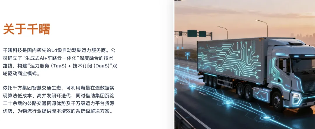 这一定位直击干线物流4万亿市场痛点:司机缺口大、成本高、安全风险突出。千曙用自动驾驶替代人力,用运力服务降低资产投入,真正把自动驾驶做成一门能赚钱、能规模化、能持续增长的好生意。