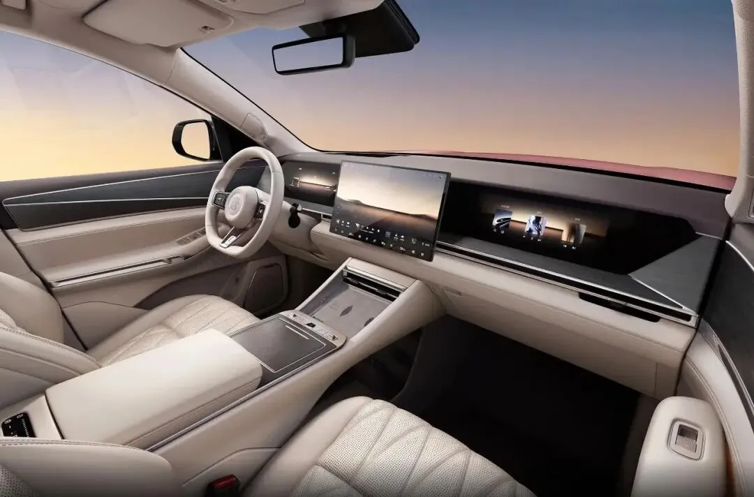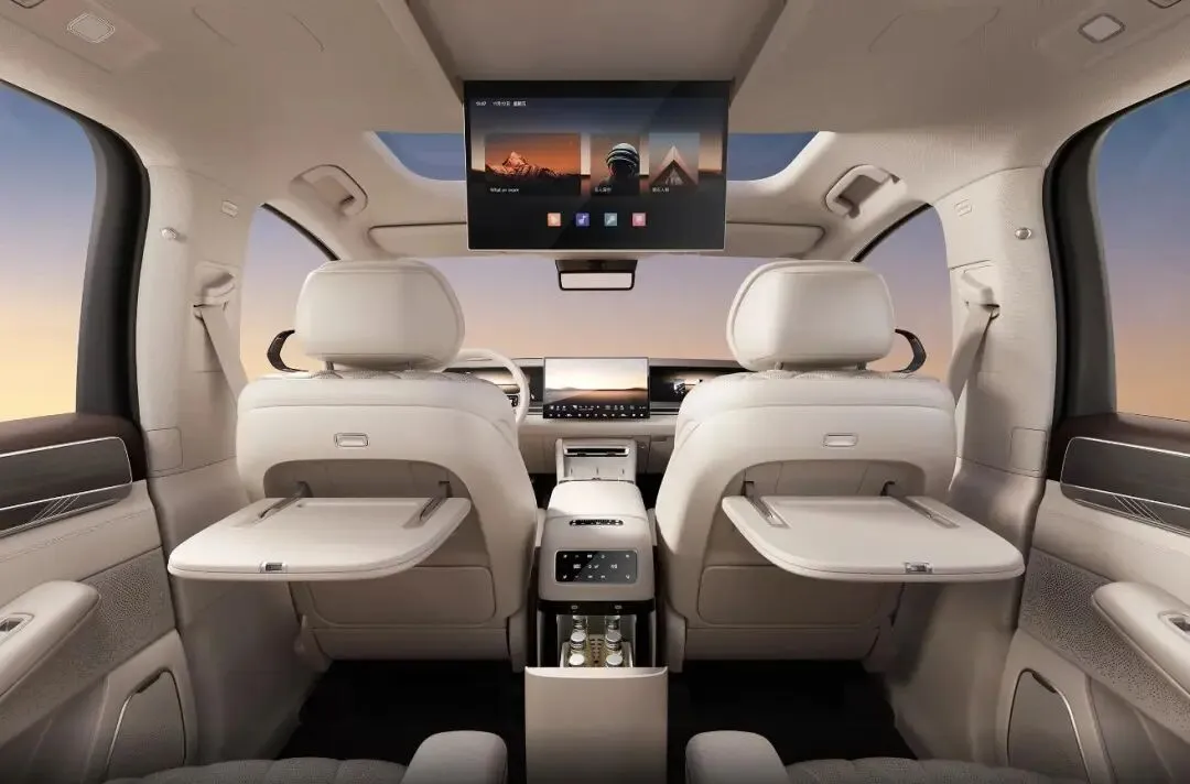 比亚迪大唐内饰延续了最近几年新能源流行的设计元素,提供4块液晶屏幕,包括全液晶仪表,悬浮式中控屏,副驾驶屏幕,后排车顶娱乐屏幕,座椅还经过菱形格处理,第二排还提供两个小桌板和车载冰箱,座椅采用2+2+3的布局方式。