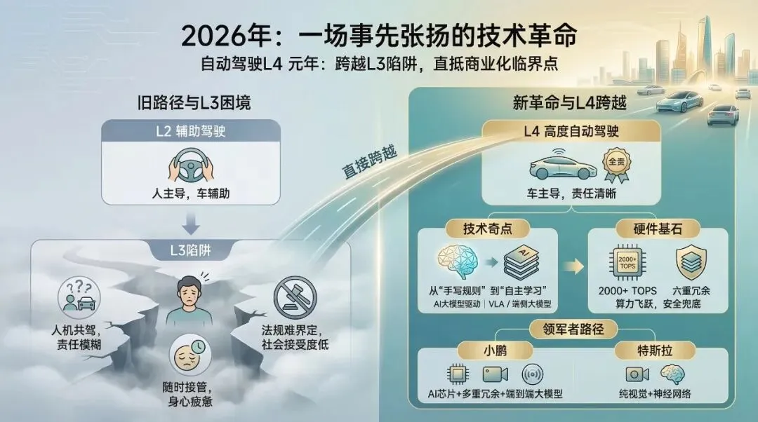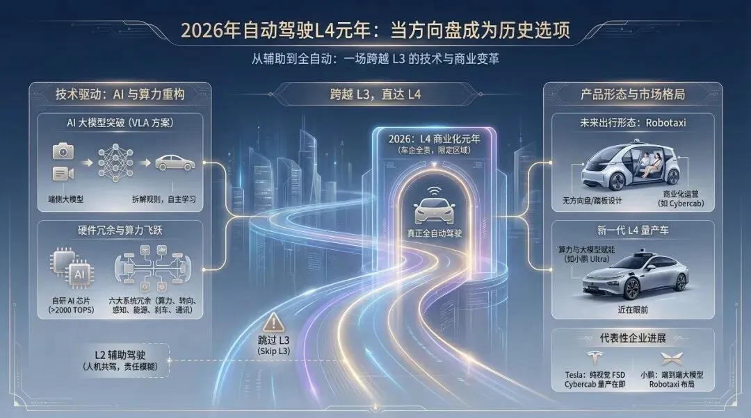 去年底,小鹏汽车董事长何小鹏在体验了特斯拉FSD V14.2后,给出了一个让整个行业振奋的判断:L4级无人驾驶已"近在眼前"。他甚至放话,如果小鹏能在2026年8月达到特斯拉去年底在硅谷的水平,就意味着超越了特斯拉。这不仅仅是一句豪言。2026年,已经被业界默认为L4自动驾驶的元年——这一概念喊了将近十年,终于要从PPT和测试车队,真正驶入普通人的生活。
