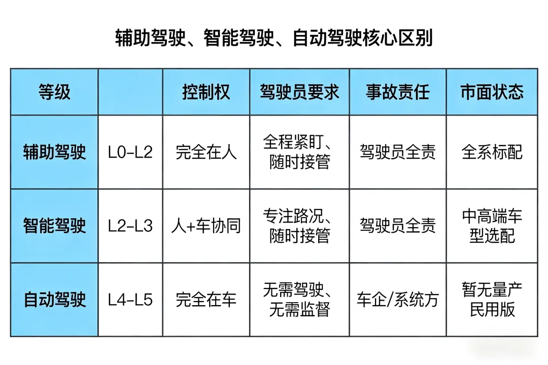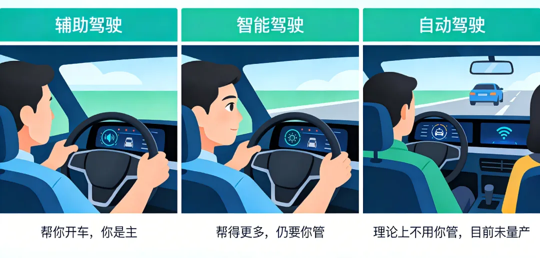 开车刷到智驾内容,满屏都是自动驾驶、辅助驾驶、智能驾驶,听起来大同小异,实际差了十万八千里!很多人被名字误导,以为上车就能放手刷手机,结果轻则扣分罚款,重则引发危险。今天用最通俗的话把这三个概念彻底掰明白,看完再也不被忽悠,开车更安全,选车不踩坑~