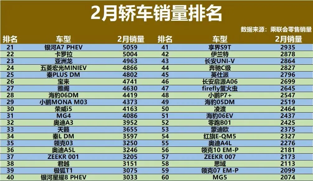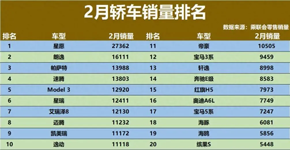 2月的轿车市场虽然仍处调整期,但看点不少。最引人注目的是,吉利星愿以超过2.7万辆的成绩拿下销量冠军,打破了合资或特斯拉常年霸榜的格局。传统燃油阵营里,朗逸、帕萨特、速腾依然稳健,月销均破万,但曾经的“家轿王”轩逸跌出前十,只卖了不到9000辆,让人意外。新能源方面,Model 3保持1.2万辆以上,比亚迪海鸥、海豚却明显下滑。豪华品牌依旧坚挺,宝马3系、奔驰E级都在8500辆以上。市场分化还在加剧,榜单尾部不少车型月销仅有个位数。遭遇大败!2月轿车销量:前20名仅5款电动车,朗逸亚军,轩逸13!