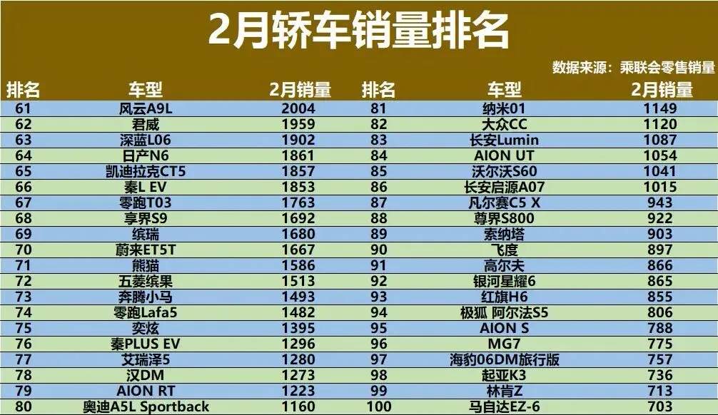 21到60名是车型最密集的区域。卡罗拉和亚洲龙分别卖出5000辆和4900多辆,但相比以往缩水明显。五菱宏光MINI EV卖了4866辆,还算稳。比亚迪秦PLUS DM和秦L DM合计贡献超8000辆,依然是走量主力。小鹏MONA M03和小鹏P7+分别卖出4373辆和2547辆,新势力在轿车领域逐渐找到感觉。享界S9T和firefly萤火虫这两张新面孔分别拿下2935辆和2645辆,市场接受度不错。传统燃油车中,君越、蒙迪欧、思域等都在2000到3000辆之间,维持着基本盘。