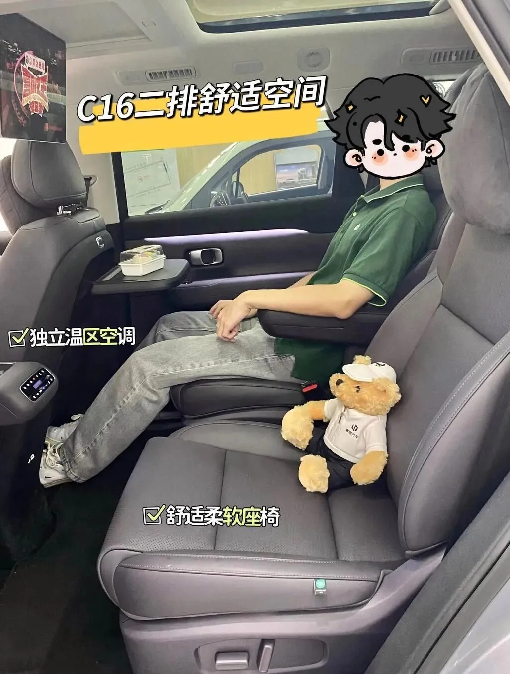 然.后重.点来了,空.间。因为我180,大家.也.都.知道。我现在坐C16第二排,腿部空间.非常.充裕,而.且是独立座椅,这个真的.加分。中间通道.我直接.站起来走一趟,不费.劲。第.三排我也钻进去了,能坐,不是.那.种“意思意思”的第三排。唐的7座我也试了,说实话,应急可以,但你要坐长途,第三排就.是.一个将就,而且上下车.不太友.好,这个是真话。