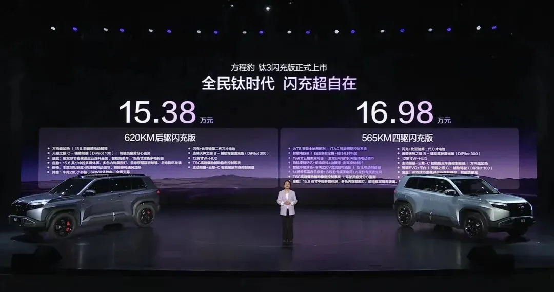 方程豹钛3闪充版昨天正式上市了,15.38万起。我没抢到发布会直播,是刷朋友圈看到李壹壹发的截图——她刚提车,后备箱塞着露营垫、冷暖箱和一个帝瓦雷小音响,车漆在阳光下泛紫光,不是那种亮得晃眼的紫,是带点灰调的、像凌晨地铁站灯光照在铝板上的颜色。她说这颜色得凑近看才懂,远看以为是黑的。