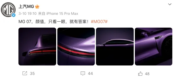 据报道,2026年MG品牌将推出4款全新车型,其中,基于全新平台打造的新能源轿跑车型——MG 07将在二季度发布,定价或在15至20万级别。
