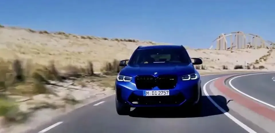 蓝色宝马SUV正面行驶在道路上,背景是沙漠地形。