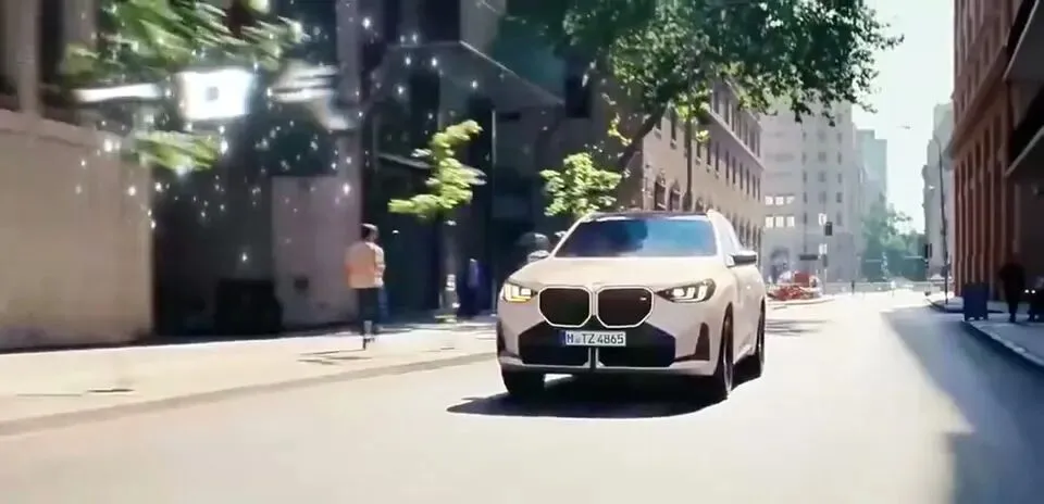 白色宝马SUV在城市街道上行驶。