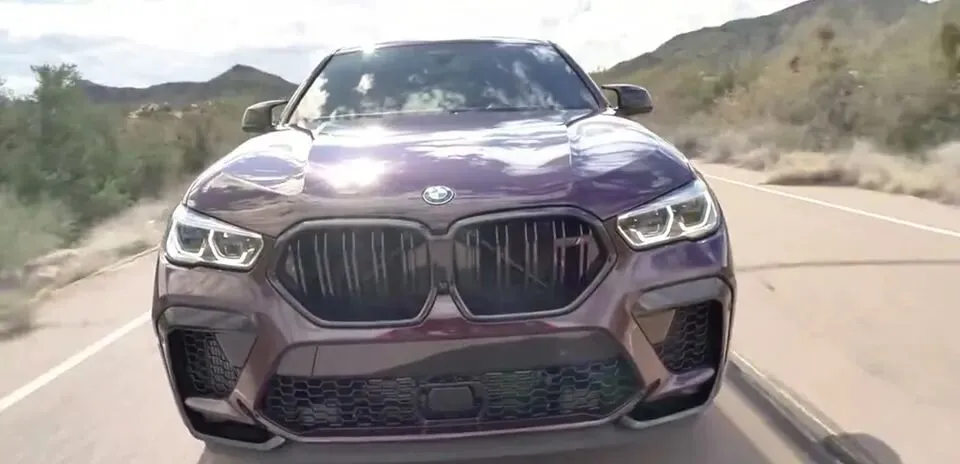 紫色宝马X6在道路上行驶。