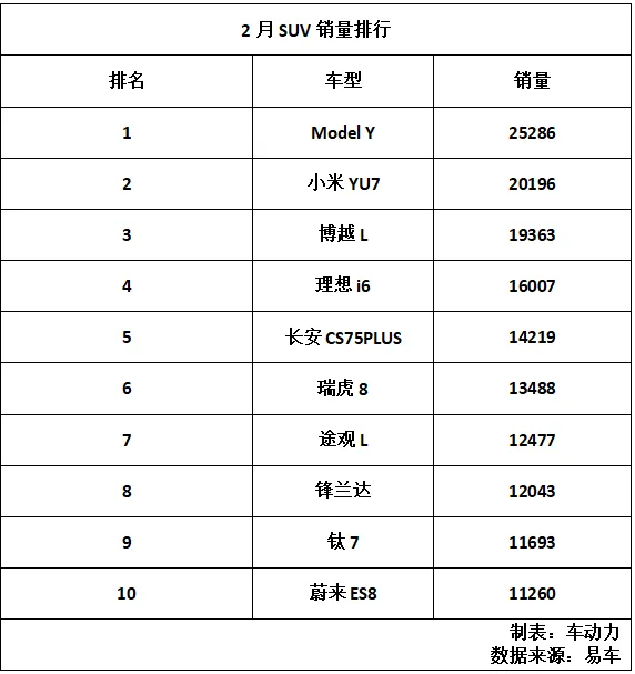 尽管2月仅有14款SUV销量破万,但头部阵营的争夺依旧激烈。特斯拉Model Y展现出强大的统治力,以25,286辆的成绩强势回击,重夺销量冠军。这主要得益于其终端灵活的金融政策加持。上个月的黑马小米YU7虽未能延续连冠势头,但仍以20,196辆的稳定表现摘得亚军。受小米工厂产能向新SU7倾斜的影响,YU7环比虽有下滑,但近半个月的订单回升预示着其后劲依然充足。