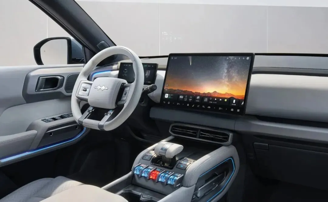内饰延续硬派与科技融合的风格,没有一味追求极简而舍弃实用性。8.8英寸全液晶仪表+15.6英寸悬浮中控屏组成双屏交互系统。还配备帝瓦雷音响、车载冰箱、无线充电等配置。