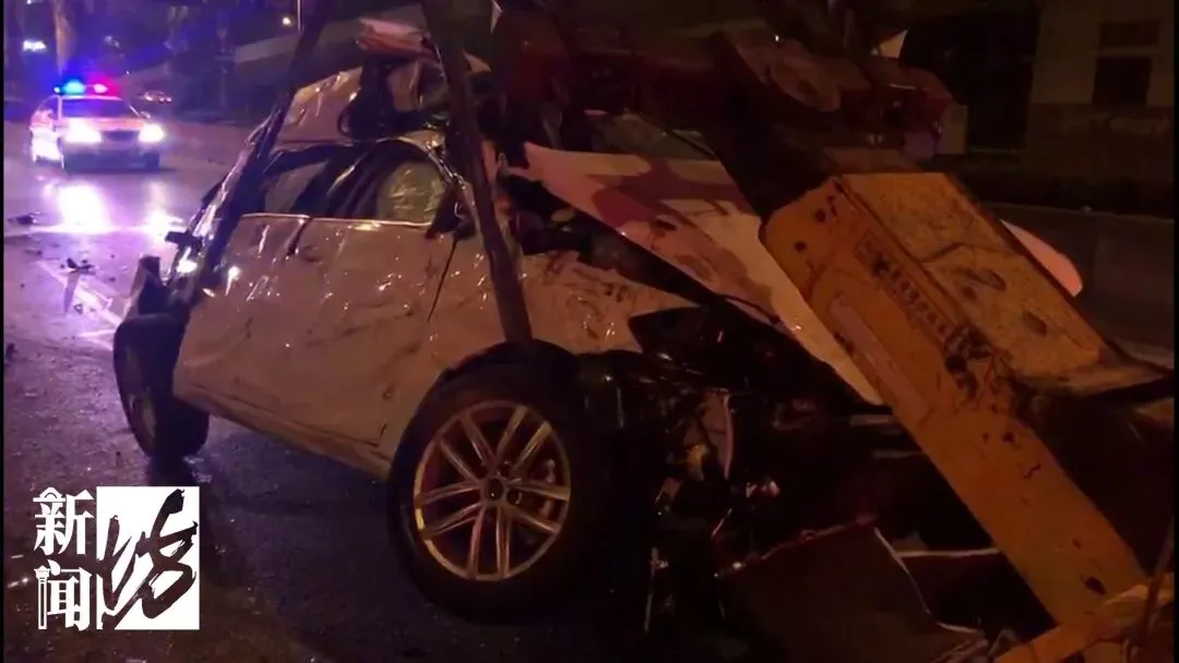 记者在现场看到,白车从高架坠落后面目全非,整个车身凹陷变形,前引擎盖完全反卷起来,发动机外露,气囊全部弹开,汽车零部件散落一地。