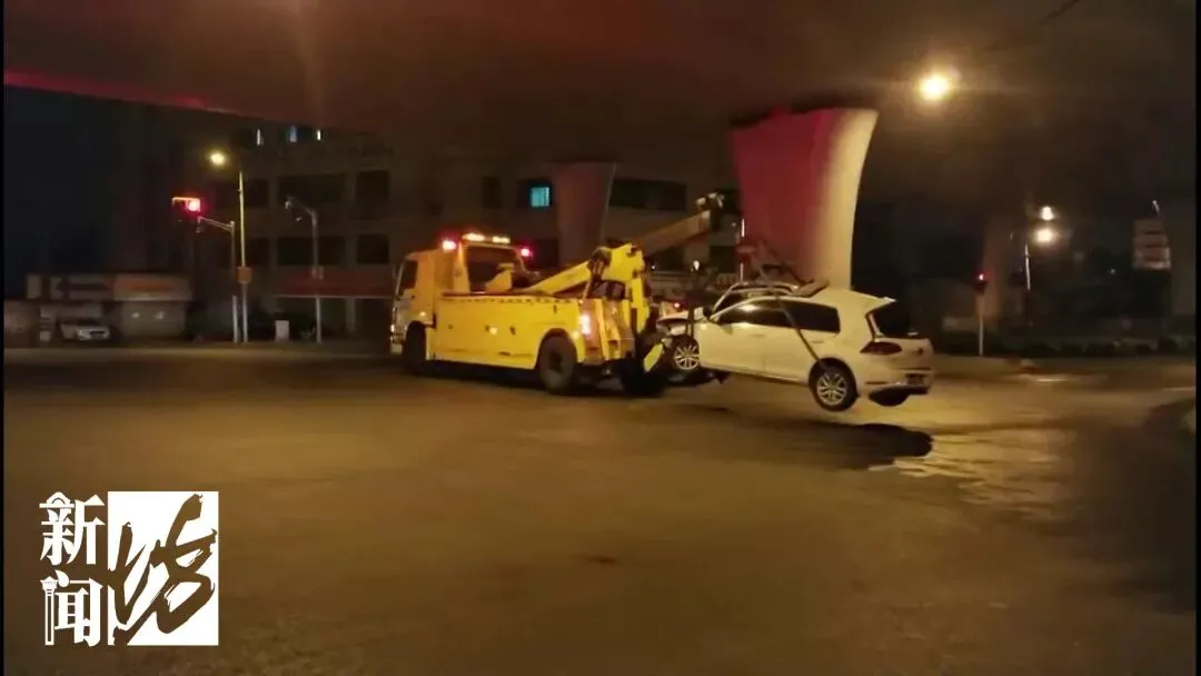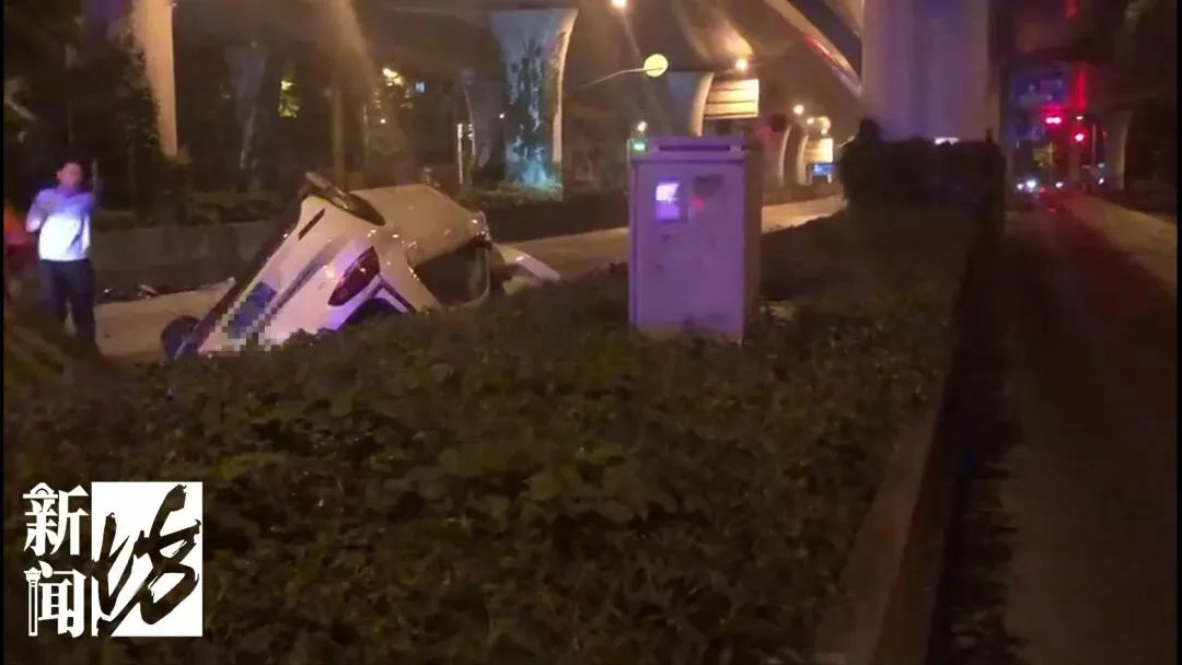 记者在现场观察发现,车辆是从中环的来回车道的间隔处坠落,正好撞击至地面车道,万幸的是,并未撞击到当时在车道上行驶的车辆。
