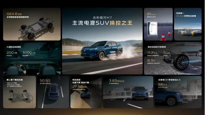 这一数据放在更宽的价格带中同样能打——参考近期20万级插混轿车的表现,银河星耀8的麋鹿测试成绩为80km/h,奇瑞风云A9L则为81.9km/h。银河M7作为一款SUV能达到这一水平,搭配35.6m的百公里制动距离、全场景智能自适应悬架等配置,实现了家用舒适性与操控乐趣的平衡。