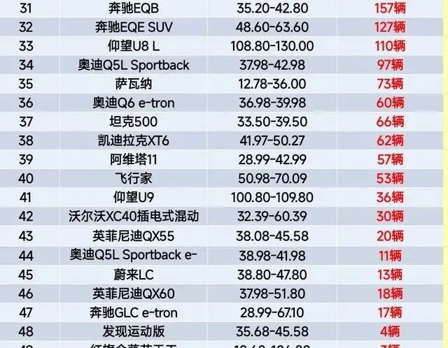 豹8只卖了两百多台,第三十名,这数据在豪华SUV里算比较冷清的,可能跟它的定位、价格以及市场宣传有关。奔驰EQB一百五十多台,三十一,纯电系列在国内的路还不好走,品牌光环能帮一部分,但消费者更在意的是实打实的体验。仰望U8L只有一百一十台,三十三名,作为一款高端新能源硬派越野,它的声量很大,但销量暂时还没形成规模。坦克500六十六台,三十七名,这个成绩对于专注越野的车型来说并不意外,毕竟它的受众相对小众。