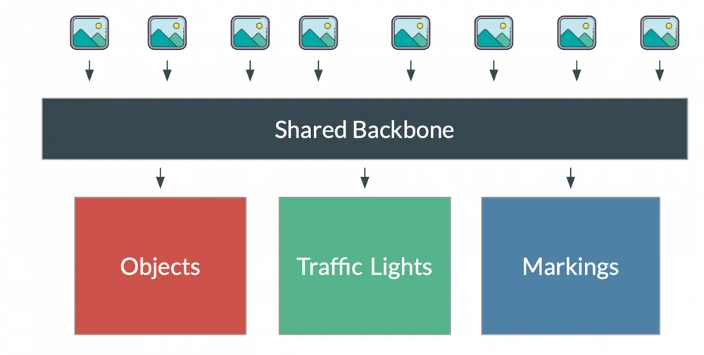 传统的自动驾驶感知往往为每个任务(如检测车道线、检测红绿灯、检测车辆)训练独立的神经网络。这种方式在车载计算资源有限的情况下极其低效,因为每个网络都要重复处理相同的图像数据。