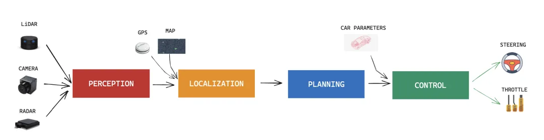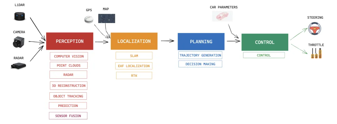 - 流程:感知(Perception)→ 定位(Localization)→ 规划(Planning)→ 控制(Control)。