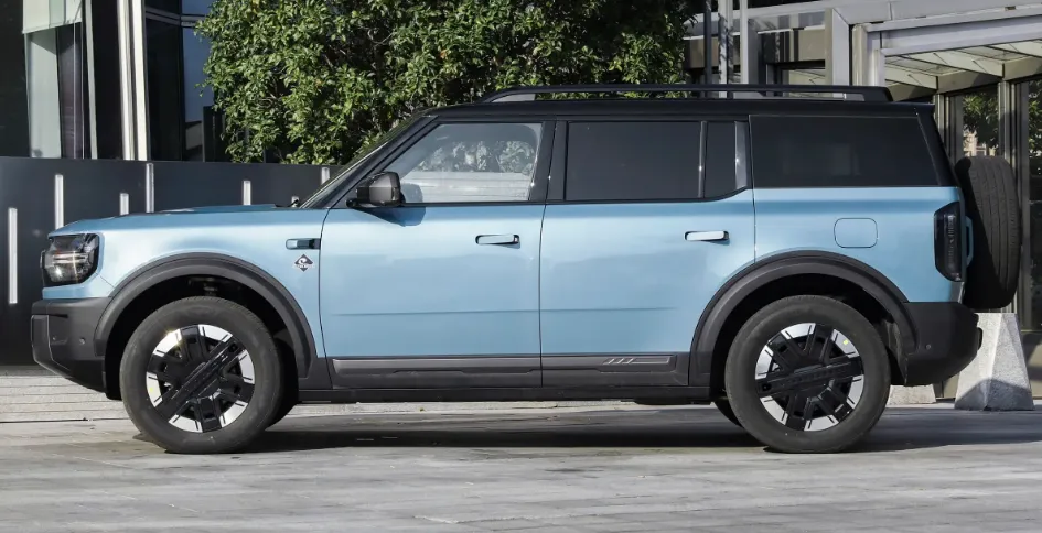 侧面线条就是典型的越野风格,平直硬朗,车窗尺寸不小,这个通透性就比较好。 轴距是2950mm ,这个数据在同级别里面算是比较长的了,后面说到空间的时候你就能感受到这个轴距带来的优势。轮毂是越野风格的设计,配的是255/60 R19的轮胎,视觉效果很饱满,然后这个轮眉也做得比较宽大,有那种防刮的设计,看着就很耐用。