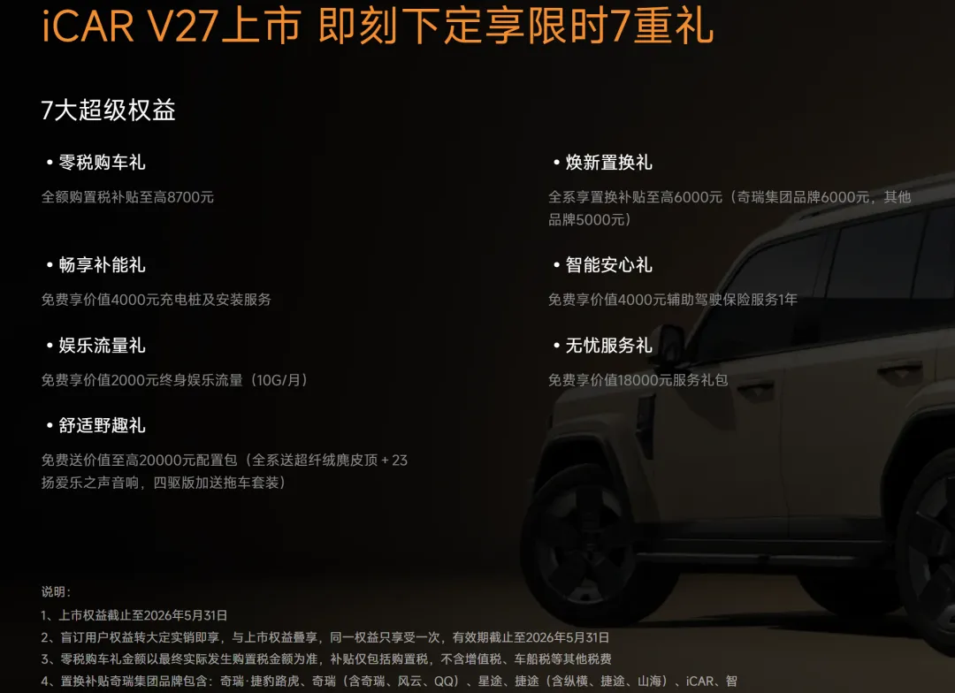 最后给大家说一下新车上市权益,2026 年 5 月 31 日前下定,均可享受: