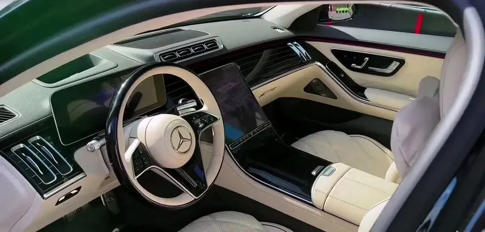 奔驰内饰是白色,中控大屏,三幅式方向盘,整体豪华大气