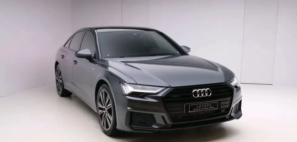 奥迪A6L,灰色车身,前脸是六边形格栅,两侧使用了科技感十足的矩阵LED大灯