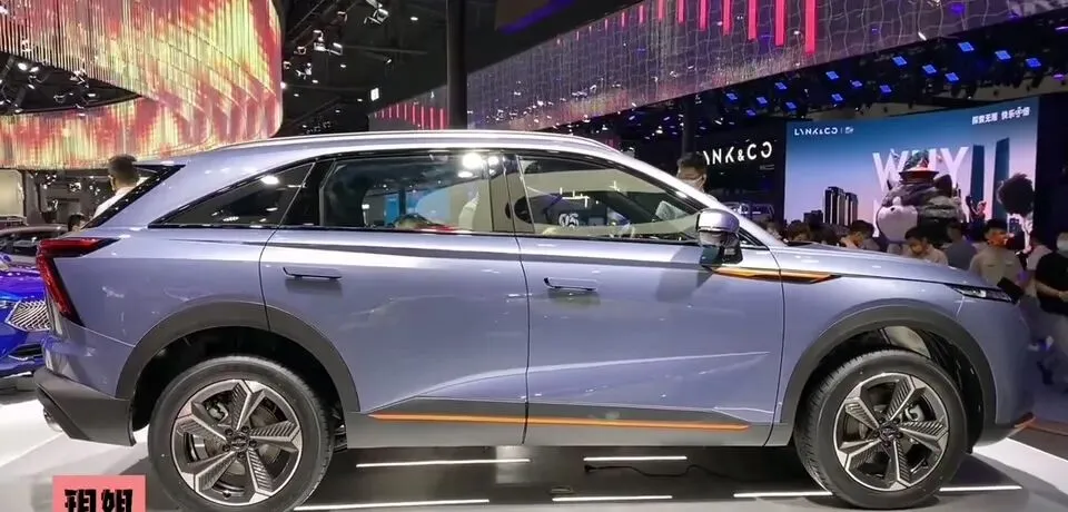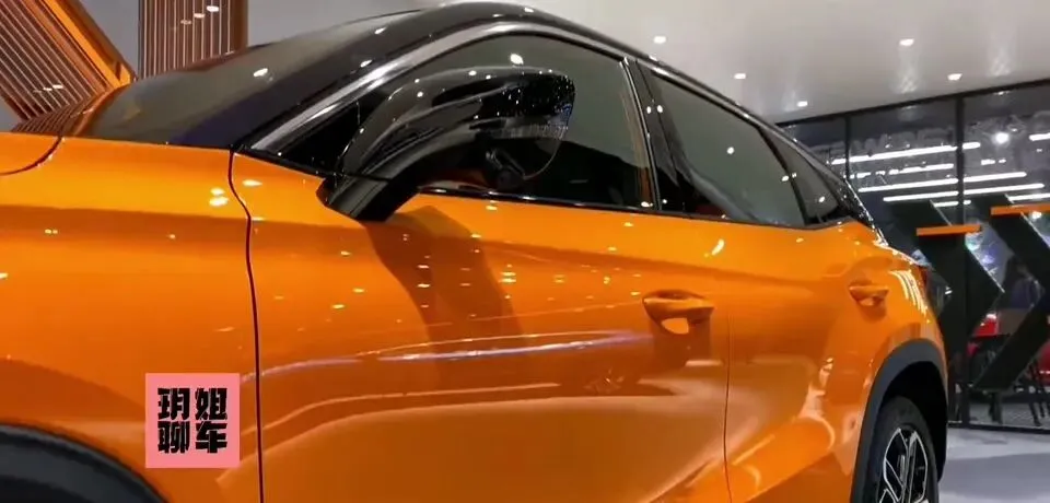 来到侧面,是“溜背式设计,整体的力量感更强”。线条棱角分明,还加入了一些橙色元素进行点缀,“再一次加大了辨识度”。
