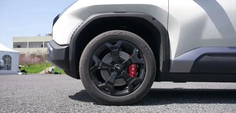 轮毂上直接印有“方程豹”的字样,红色卡钳也非常醒目。整体气质不是走温和路线,而是明显偏向性能取向。