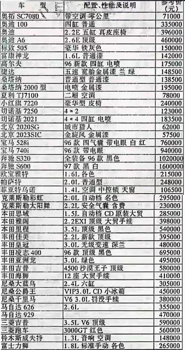 前两天,翻出来了一张1996年的轿车价格单,那一瞬间,真的有点感慨:现在想买买二手车、约约顺风车多容易啊,可三十年前,能有一台属于自己的轿车,那真是身份和地位的象征!昨天还和老爸聊天,他说起村里首富买了奥迪100和大哥大那场面,啧啧,咱普通人想都不敢想。你有没有发现,90年代,车价已经贵得让人头皮发麻了?