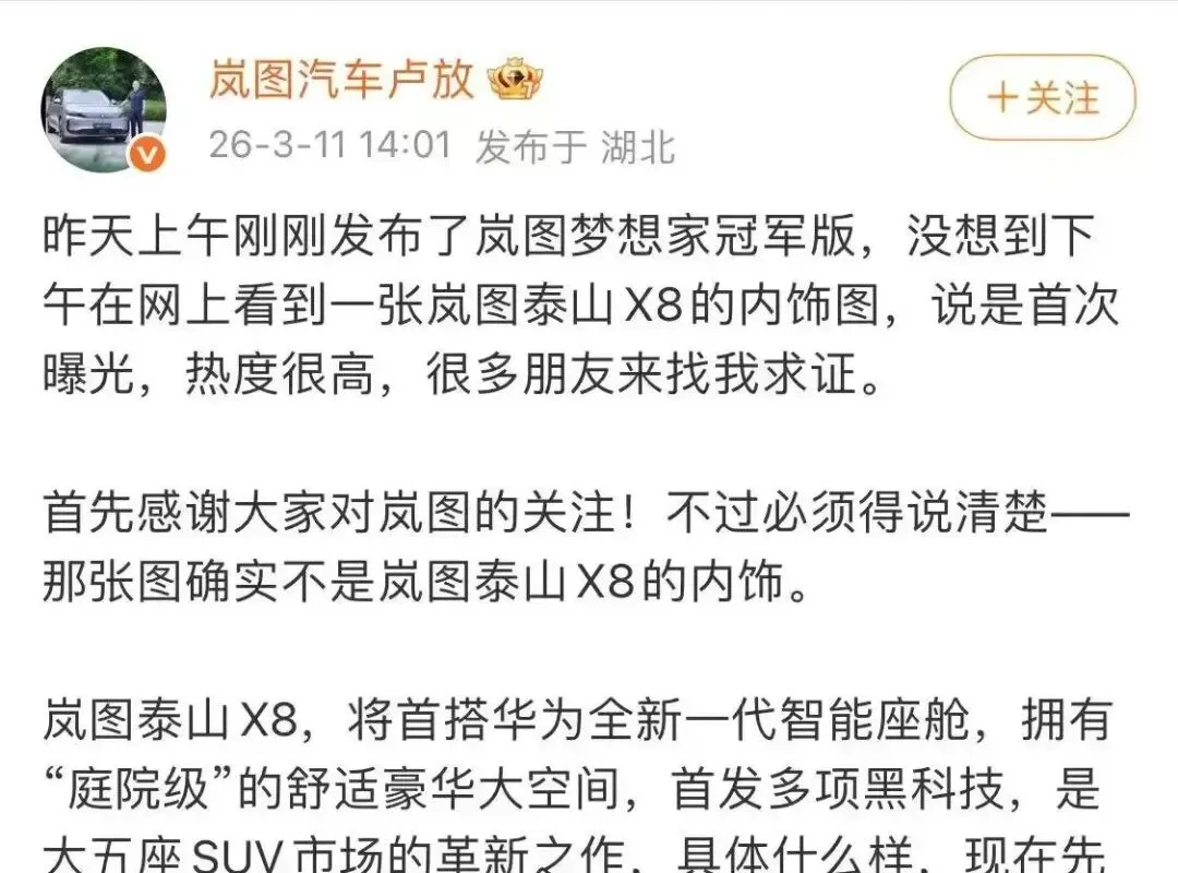 岚图董事长卢放凌晨发声明:“X8内饰谍照纯属谣言!”可朋友圈早被高清图刷爆了——这车一亮相,直接让全网剁手党集体破防:为啥价格比预期低5万,还塞进华为黑科技?