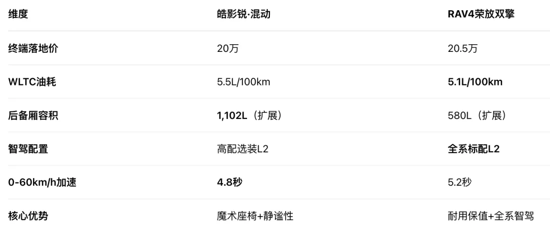 根据您的20万预算及混动SUV需求,结合大飙车拆解数据与实测结论,以下为本田皓影锐·混动与丰田RAV4荣放双擎的深度对比及同级别车型推荐方案: