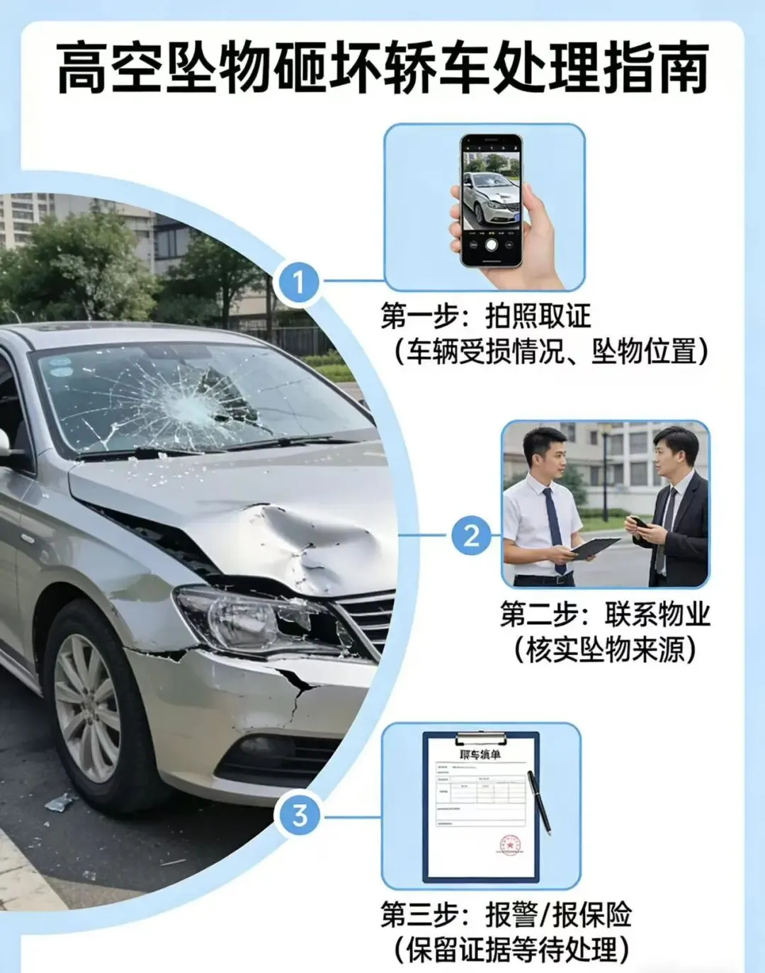 爱车停楼下,被高空坠物砸出大坑、天窗碎裂,真的太糟心!别自认倒霉、别乱找邻居扯皮,法律+流程一步到位,看完不花冤枉钱。