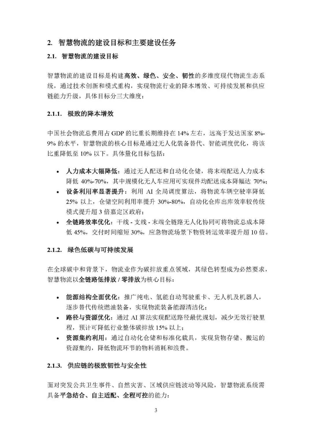 三大建设目标:极致降本增效(将社会物流总费用占 GDP 比重降至 10% 以下,大幅降低人力成本、提升设备利用率);绿色低碳可持续(优化能源结构、降低碳排放、集约利用资源);供应链极致韧性与安全(实现无人化应急作业、货物全生命周期追踪、供应链自愈)。