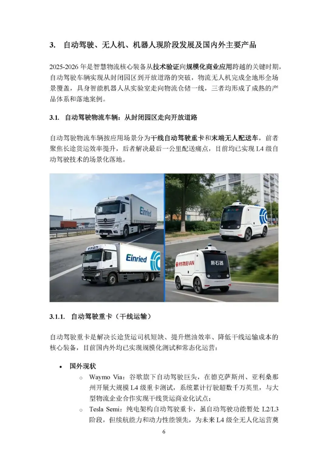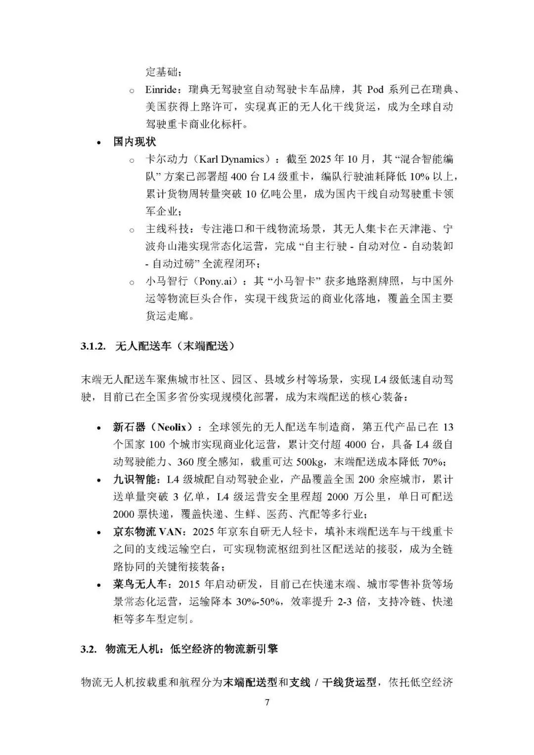 自动驾驶物流车辆:分干线重卡(国内外 L4 级技术场景化落地,如卡尔动力、Waymo Via)和末端无人配送车(新石器、九识智能等实现全国规模化部署),从封闭园区走向开放道路。