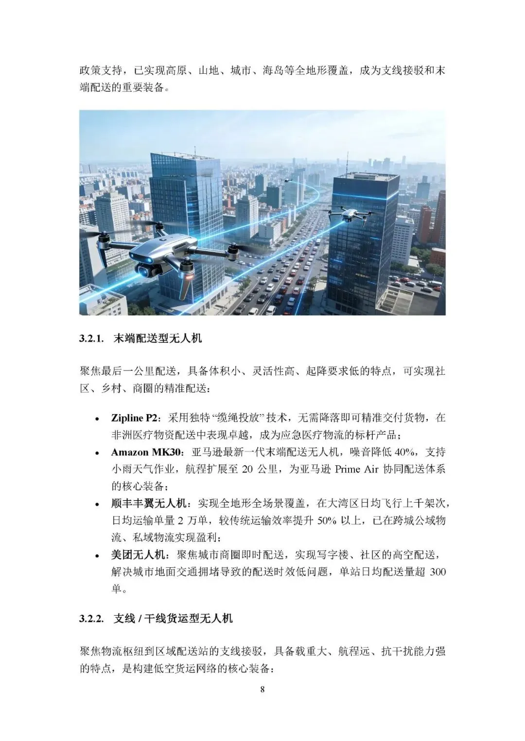 物流无人机:作为低空经济新引擎,分末端配送型(顺丰丰翼、亚马逊 MK30)和支线 / 干线货运型(大疆 FlyCart、腾盾大型无人机),实现全地形全场景覆盖。