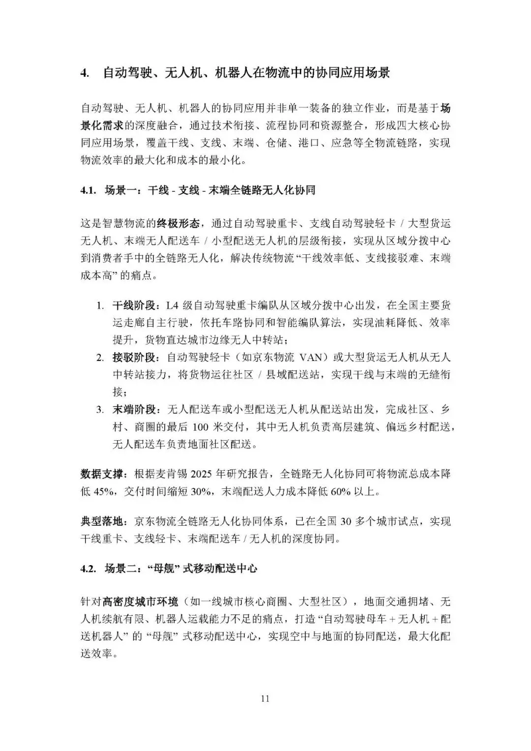 国内京东物流:构建干线 - 支线 - 末端全链路无人化协同体系,通过物流大脑实现全局调度,试点实现干线油耗降 12%、末端人力成本降 55%,经验在于全产业链布局、技设协同、政企合作。