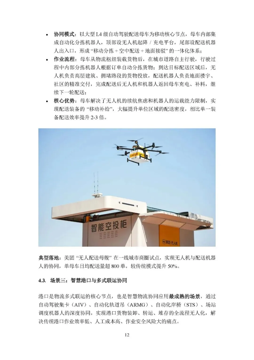 干线 - 支线 - 末端全链路无人化协同:通过自动驾驶重卡、支线轻卡 / 货运无人机、末端配送车 / 无人机层级衔接,实现从分拨中心到消费者的全流程无人化,可降本 45%、缩短交付时间 30%。
