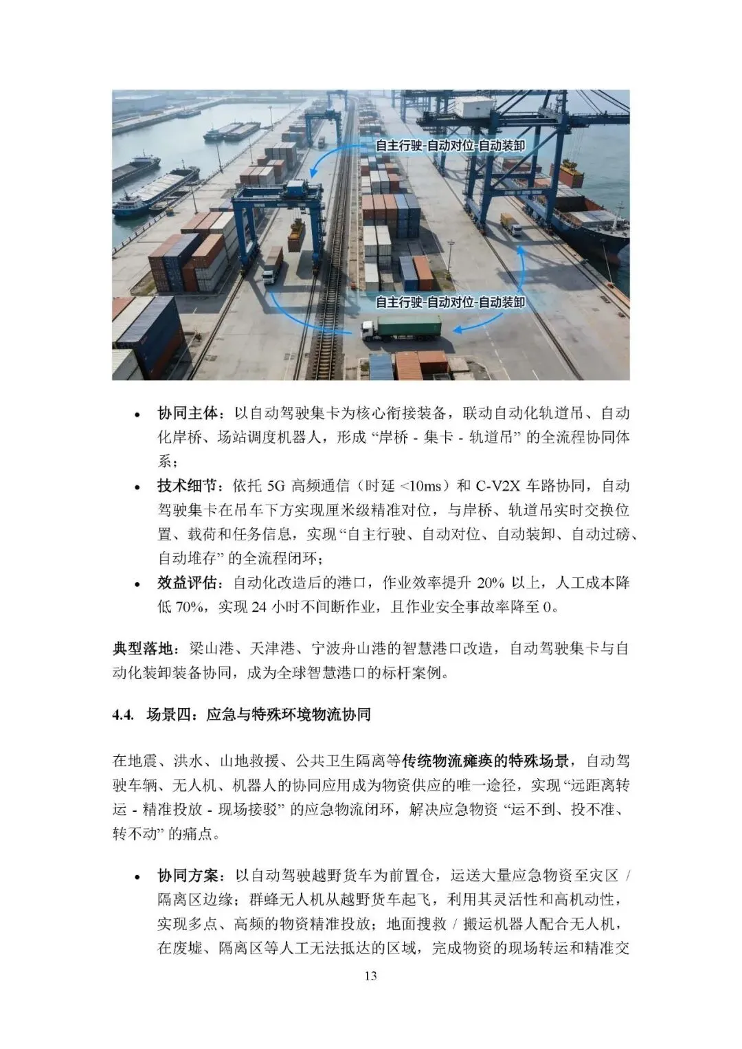 智慧港口与多式联运协同:通过自动驾驶集卡联动自动化岸桥、轨道吊等,实现港口作业全流程无人化,作业效率提升 20%、人工成本降 70%。