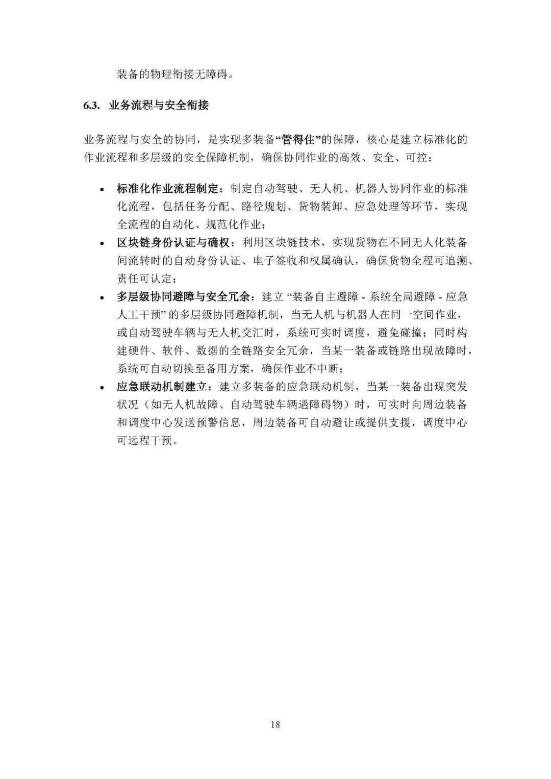 三大装备衔接规划:统一通信协议与数据标准,打破数据壁垒并构建数字孪生平台;标准化物理接口与载具,推广统一周转箱并研发精准对位机构;制定标准化业务流程,建立区块链确权、多层级避障和应急联动机制,保障作业安全可控。