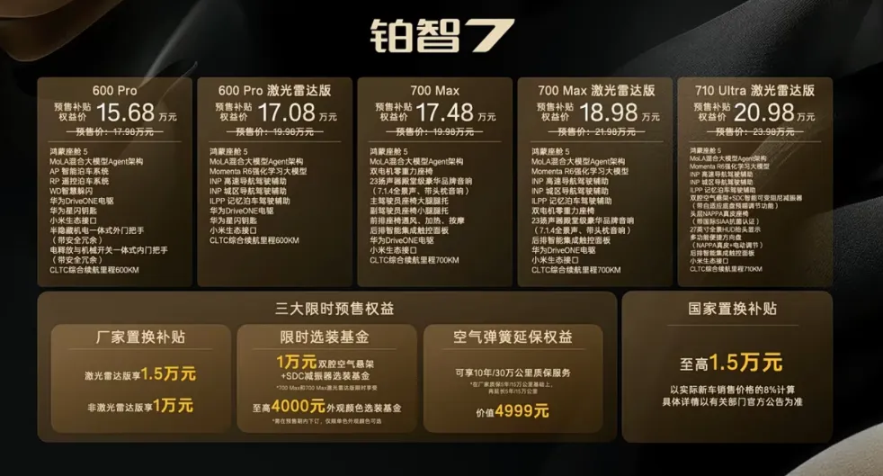 先从购车权益来看,目前丰田铂智7针对非激光雷达版提供10000元限时置换补贴,激光雷达版则是15000元。除此之外,部分车型还可享受10000元的双腔空悬+SDC减振器选装基金。