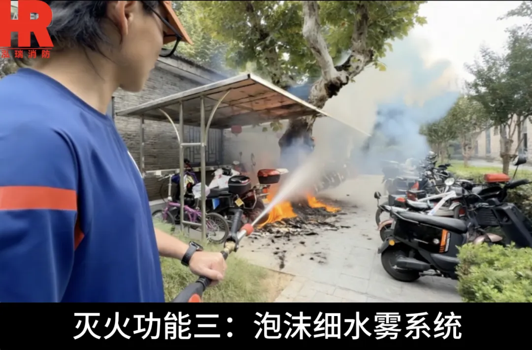 泡沫细水雾:一键启用,可进行初期灭火,配备20米卷管器,3秒内快速出水,流量达34L/min,灭火等级高达10A、233B,适用于多种火灾类型。